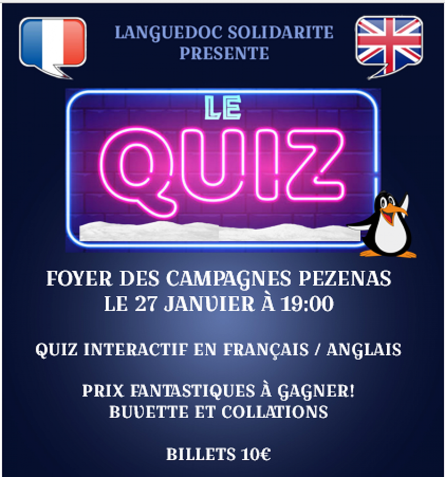 The famous Quiz team is leaving its base in Pézenas to host a Quiz evening in Béziers on March 19 at La Cimade, 14 rue de la Rotonde at 7 p.m. Our quiz masters will challenge you with this fun and interactive quiz! Teams of 6 will be put to the test with questions on music, general knowledge, surprise questions and much more!
